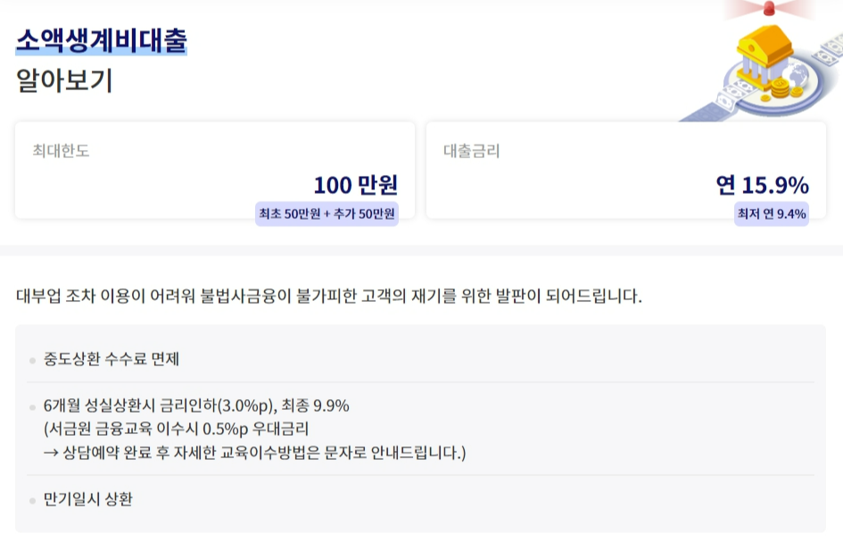 - 반복 이용이 가능한지? 한정된 재원을 감안하여, 보다 많은 분들을 지원하기 위해 소액 생계비대출은 동일인 1회만 이용가능합니다.