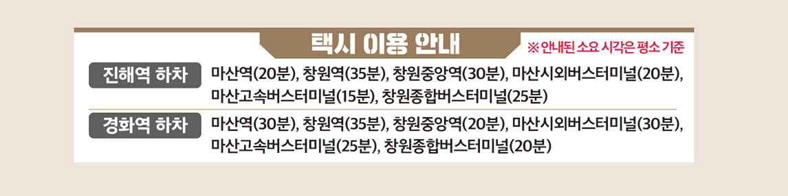 - 고속버스 → 마산고속버스 터미널 하차 → 북원로터리 (버스 162번, 160번, 760번 진해역 하차 :약 35분 소요 / 택시 : 20분 소요)