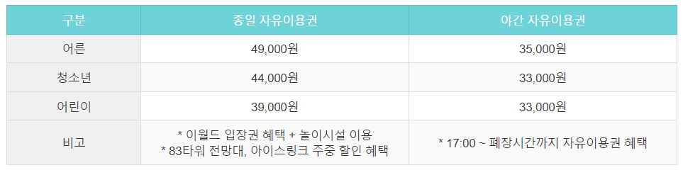 | 구분 | 종일 자유이용권 | 야간 자유이용권 | ||